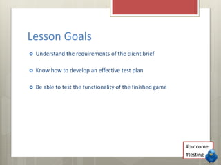 The document outlines the goals, marking criteria, and tasks for a lesson on testing a digital game. The lesson aims to have students understand client requirements, develop a test plan, and test the functionality of a finished game. Students are to create a test plan that tests features of the game like doors, characters, and objectives against expected outcomes, identifying any improvements made.