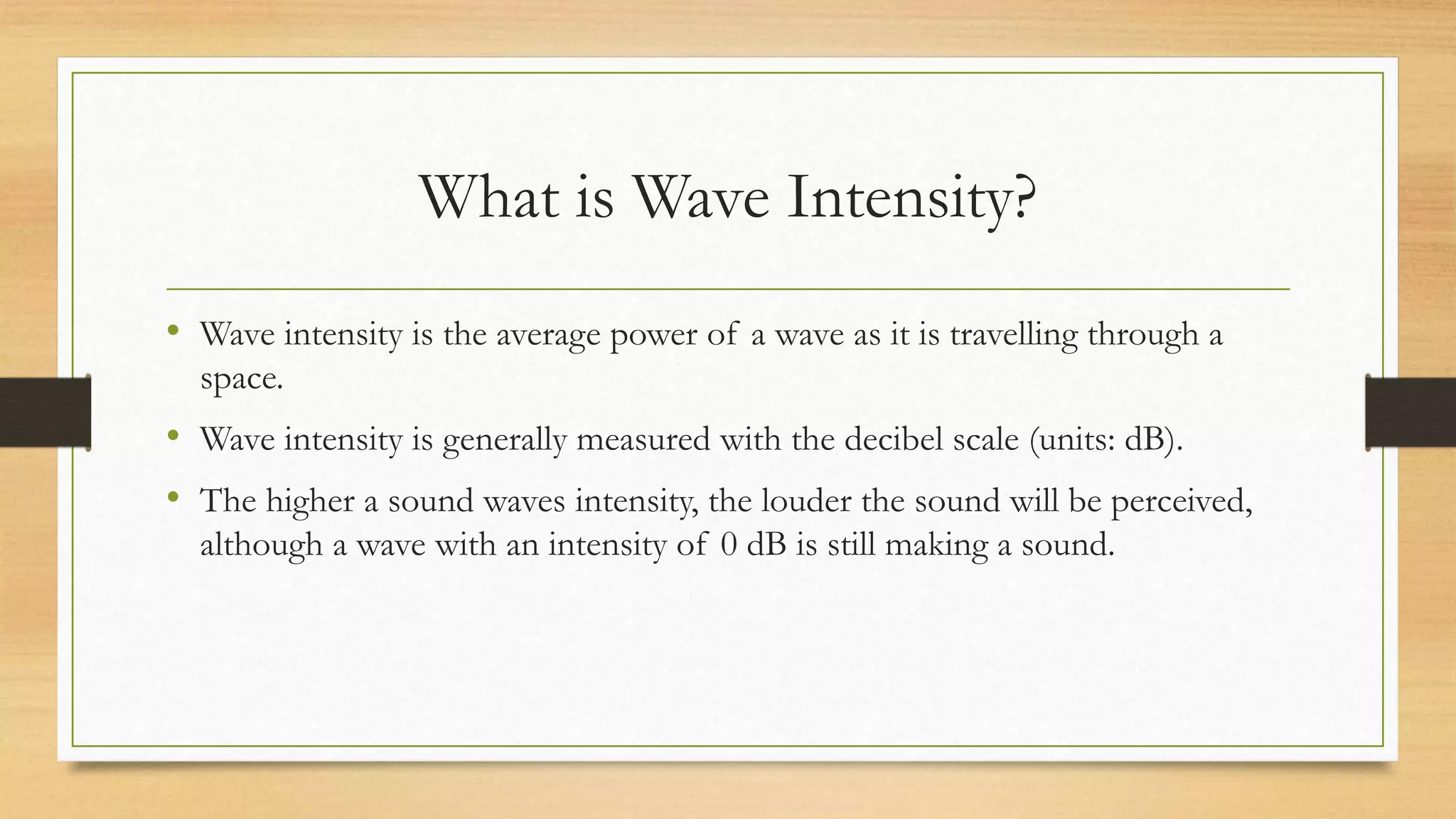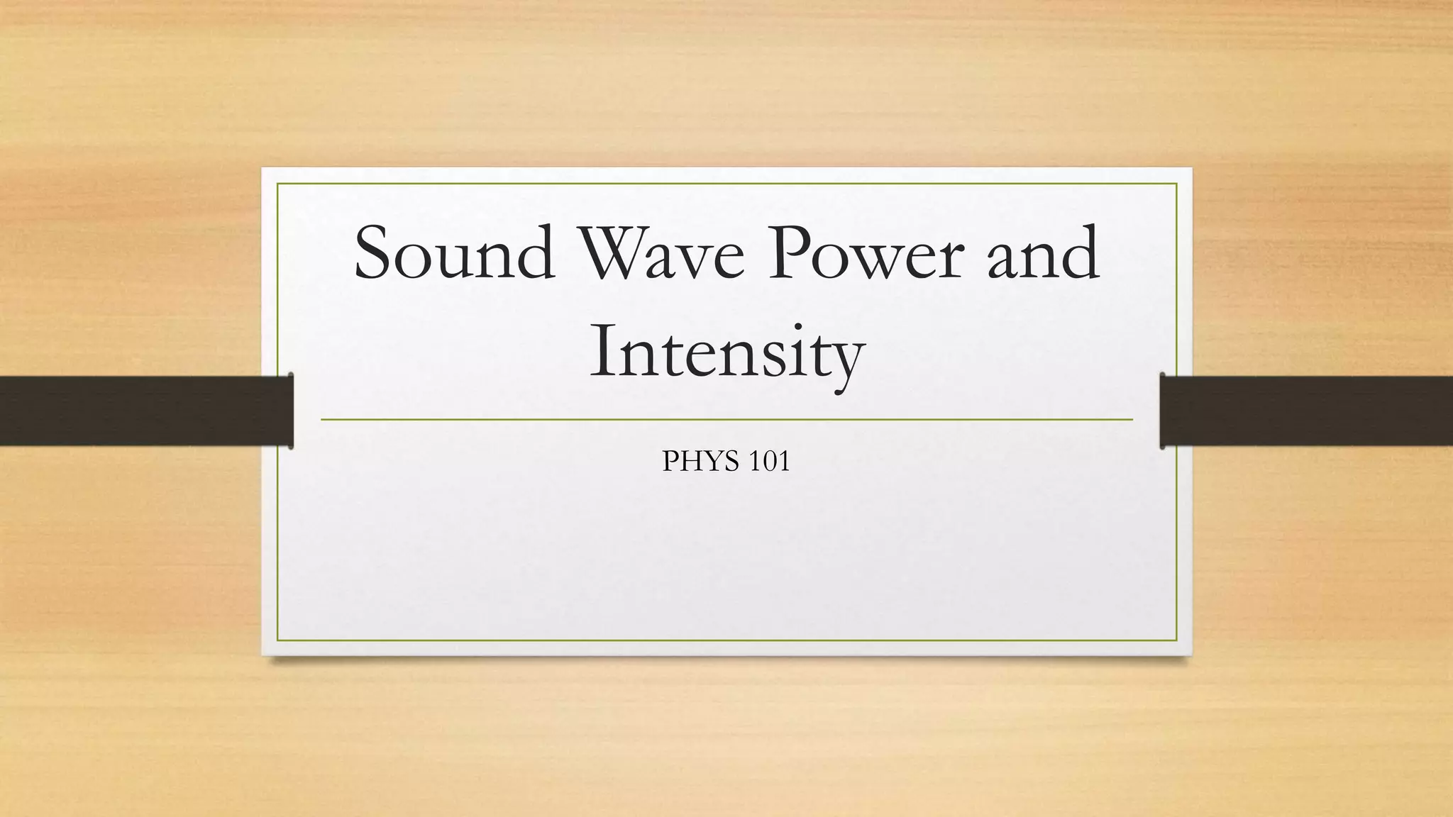 Wave intensity is the average power of a sound wave measured in decibels (dB), which perceives louder sounds with higher intensity. The intensity decreases with distance as it spreads out over a larger area, following the formula intensity = power/area. The document also discusses calculations related to average power, maximum particle displacement, and the effects of frequency changes on wave properties.