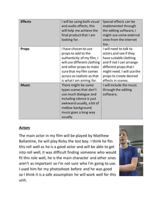 The document provides details on the equipment, software, actors, and other resources the student will use to create a film. Key equipment includes a camera, tripod, SD card and reader, headphones, computer, editing software, stock footage, effects, props, and music. The main actor will be Matthew Ballantine. Legal considerations include copyright and permissions for any additional content. The film may be submitted to an online film festival, requiring adherence to rules. A contingency plan addresses risks like actors backing out or locations becoming unavailable. The target budget is £100 and planned launch date is July.