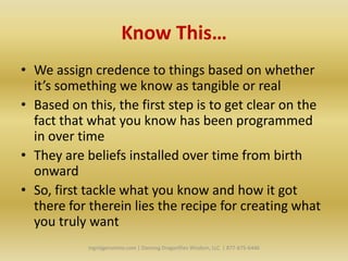 The document outlines a process for using the Law of Attraction (LOA) to create what you want. It explains that our beliefs come from programming over time and the first step is understanding how our beliefs were formed. Everything starts with a thought, and we are always creating either positively or negatively based on our focus. Creations manifest when we feel their possibility through focused desire. Knowing informs feeling, which brings thoughts into fruition when combined with trust and faith. The final steps are to prepare to receive your creation, then relax and let the process unfold through divine timing.
