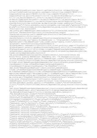 This document contains code for initializing and loading various JavaScript modules used by MediaWiki. It defines dependencies between modules, registers modules to be loaded, and includes code for embedding media players, handling timed text, and integrating with the MediaWiki API. The document loads jQuery and various jQuery plugins, and defines modules for MediaWiki core functionality, skins, actions, special pages, and legacy code integration.
