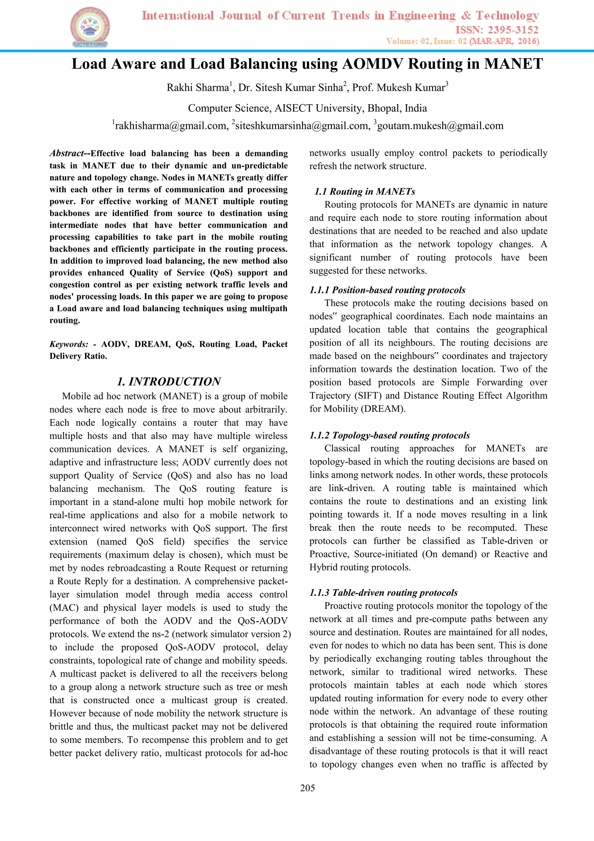 This document discusses load aware and load balancing techniques using multipath routing in mobile ad hoc networks (MANETs). It proposes using a location aided routing (LAR) protocol with the Ad-hoc On-demand Multipath Distance Vector (AOMDV) routing protocol to identify multiple routing backbones from the source to destination nodes based on the intermediate nodes' communication and processing capabilities. This helps distribute traffic loads evenly across multiple paths to improve load balancing, reduce congestion, and enhance quality of service in the MANET.