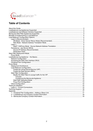 This deployment guide provides instructions for configuring Loadbalancer.org appliances with Barracuda Web Filter products, highlighting supported models and software versions. It covers load balancer configuration options, recommended deployment architectures, and maintenance procedures for high availability. The guide also includes detailed steps for setting up virtual services, real servers, and web filter configurations essential for effective load balancing.