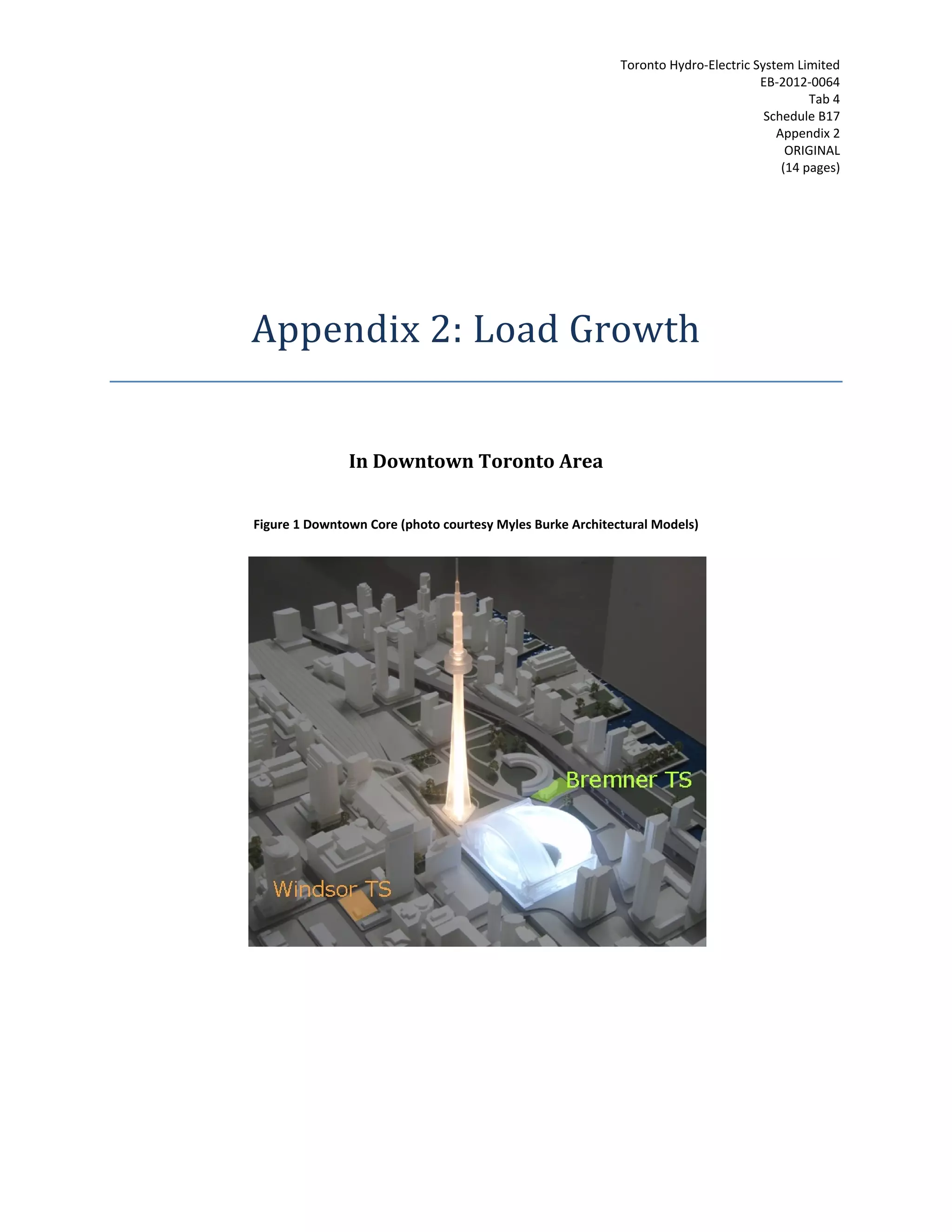 This document discusses load growth methodology and forecasts for transformer stations in downtown Toronto, with a focus on the area around the future Bremner Transformer Station. Load growth is forecasted using a model that considers weather sensitivity, historical peak demand growth rates, and anticipated new customer connections. The City of Toronto's plans for development and numerous proposed new buildings will likely contribute to increased electricity demand in the downtown area. Customer connection requests received by Toronto Hydro total over 65 MVA of additional load for the area near Bremner and Windsor Stations.