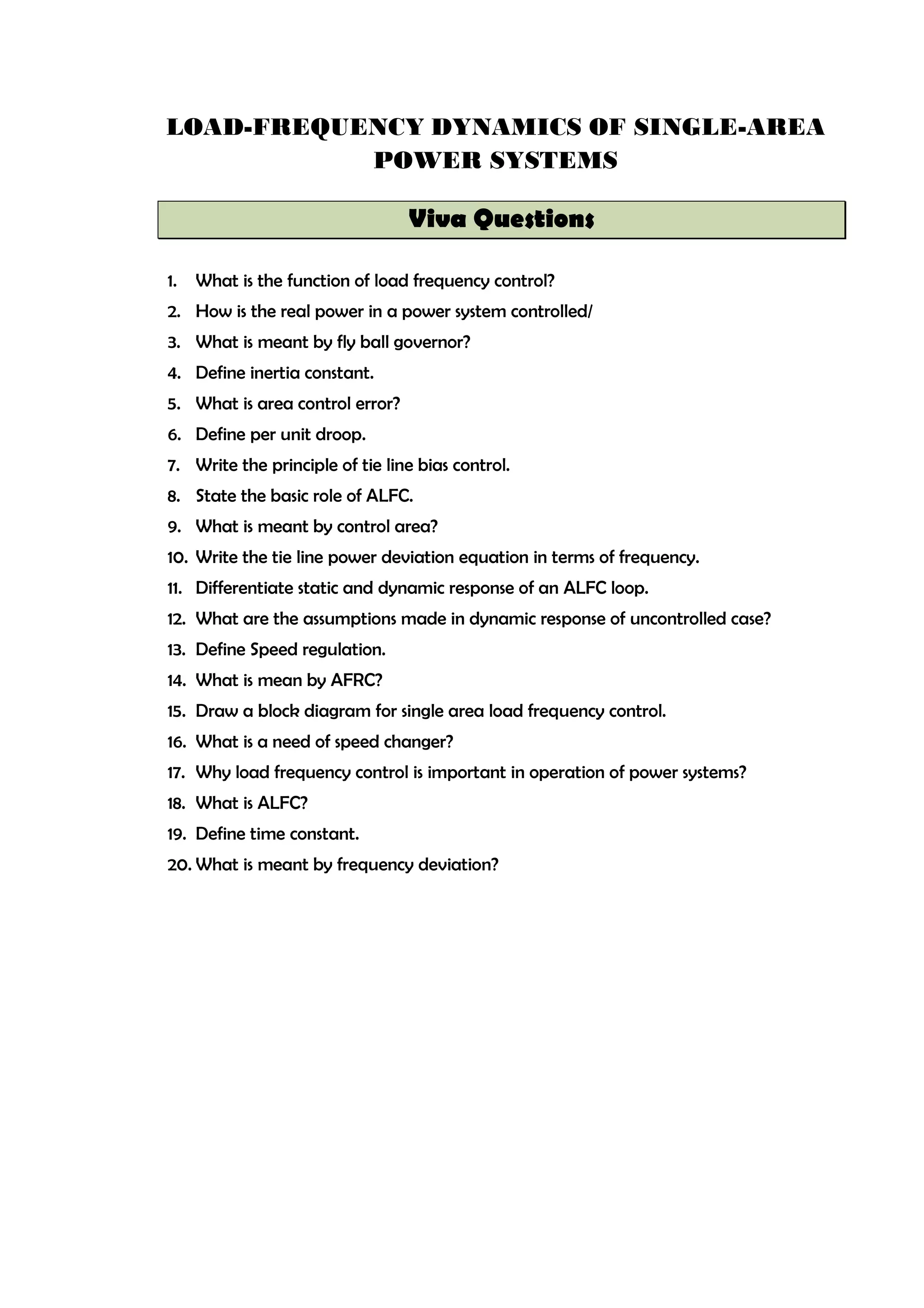 This document contains 20 questions about load-frequency control in single-area power systems. The questions cover topics like the function of load frequency control, how real power is controlled, definitions of terms like fly ball governor, inertia constant, area control error, per unit droop, tie line bias control, and the basic role of automatic load frequency control. It also asks about control areas, tie line power deviation equations, static and dynamic responses, assumptions in dynamic response modeling, speed regulation, automatic frequency response control, block diagrams, the need for speed changers, the importance of load frequency control, and definitions of time constant and frequency deviation.
