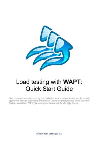 The document is a quick start guide for load testing using WAPT, detailing the process to create and execute a web application test scenario. It covers creating virtual user profiles, navigating through the test wizard, and managing parameters for accurate session emulation. Additionally, it explains the importance of parameterization and test verification for ensuring effective load testing results.