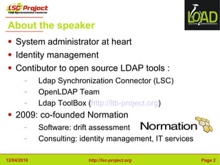 The document discusses the LDAP Synchronization Connector (LSC), an open-source project designed to automate the synchronization of identity information across different databases and directories. It highlights the importance of maintaining consistent user accounts and offers a flexible solution for synchronization using configurable transformations and standard protocols. The LSC project aims to enhance functionality, usability, and performance for identity management tasks across various systems.