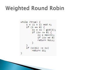 The document discusses load balancing techniques in distributed systems. It explains static and dynamic load balancing algorithms such as round robin, random, central manager, and threshold algorithms. Genetic algorithms and their application to load balancing problems are also covered. The performance of different load balancing strategies is evaluated based on metrics like execution time, dropped packets, and processor utilization. Specifically, the document finds that distributing load based on processor capabilities using a Fibonacci weighting scheme can maximize utilization of high-capability processors and minimize load on low-capability processors.