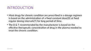 The document discusses the concept of loading and maintenance doses in pharmacology, emphasizing the importance of achieving steady-state drug concentrations quickly in chronic conditions. It defines loading doses, explains their role in establishing therapeutic levels, and outlines the factors influencing both loading and maintenance doses based on pharmacokinetics. Additionally, it highlights the relationship between dosing intervals and drug concentrations in maintaining therapeutic ranges.