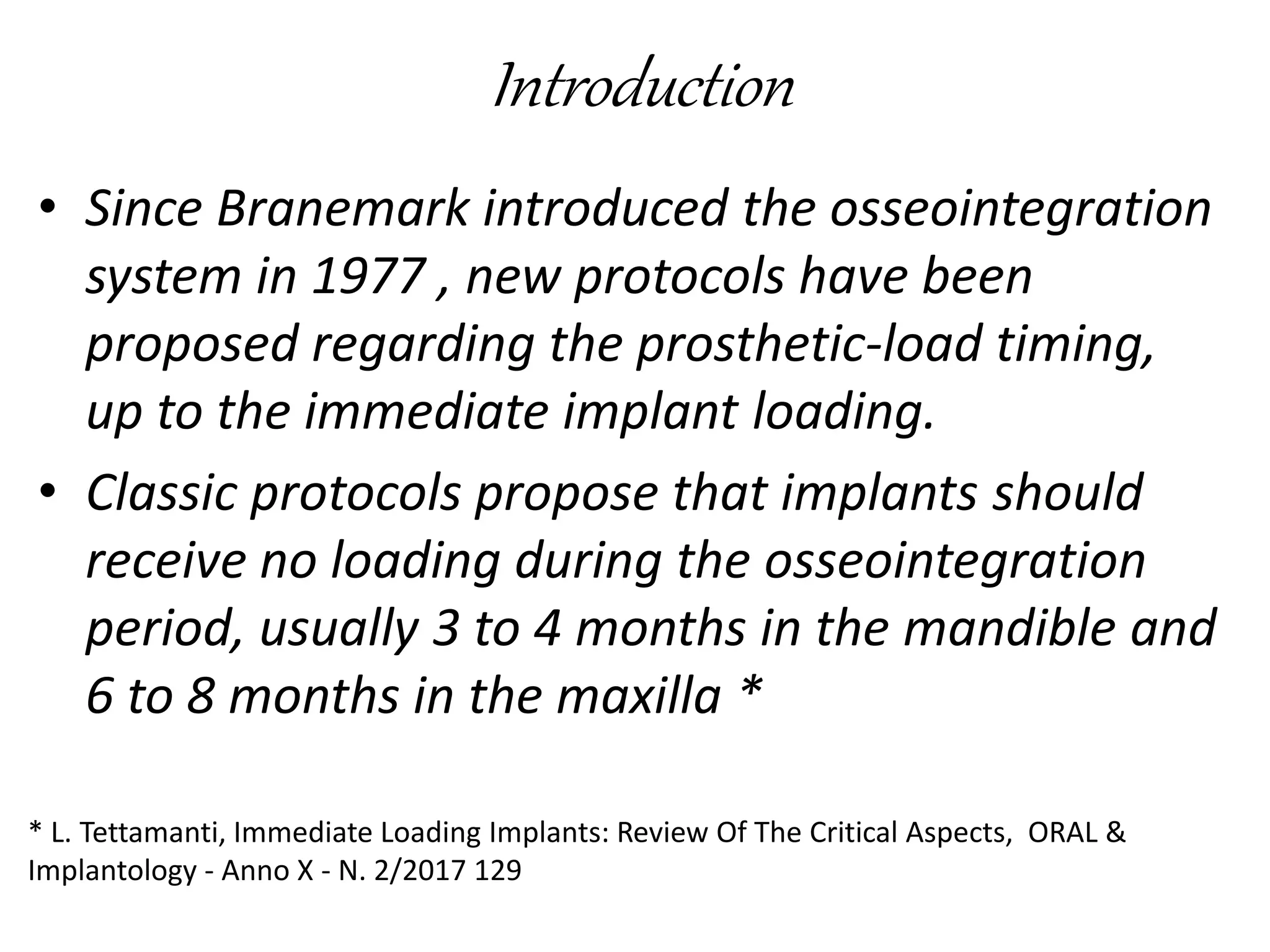 The document discusses various loading protocols for dental implants, including immediate, early, and conventional loading methods, highlighting the importance of primary stability and patient selection for successful outcomes. Several guidelines for immediate loading are provided, including recommendations based on bone quality, implant size, and patient conditions. It also emphasizes the distinctions between implant placement at the time of extraction versus healed sites, stressing the need for careful planning and evaluation of the bone and tissue conditions.