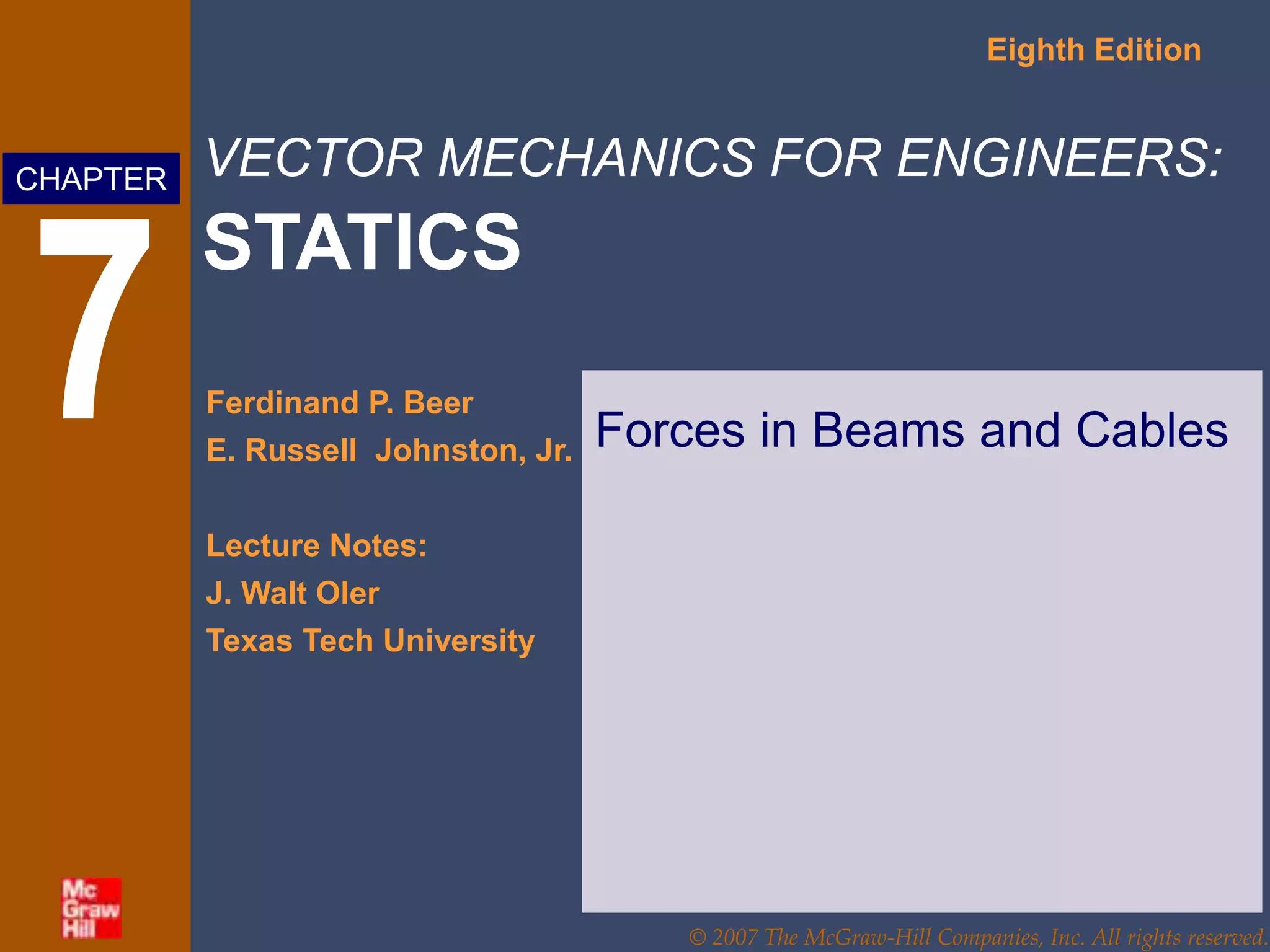 This chapter discusses forces in beams and cables. It introduces internal forces like tension, compression, shear, and bending that hold together parts of structural members. Beams experience shear forces and bending moments when subjected to concentrated or distributed loads. Methods are presented for calculating the reactions, shear forces, and bending moments in beams under different loading conditions. These include drawing shear force and bending moment diagrams. Relations between applied loads, shear forces, and bending moments in beams are also covered.