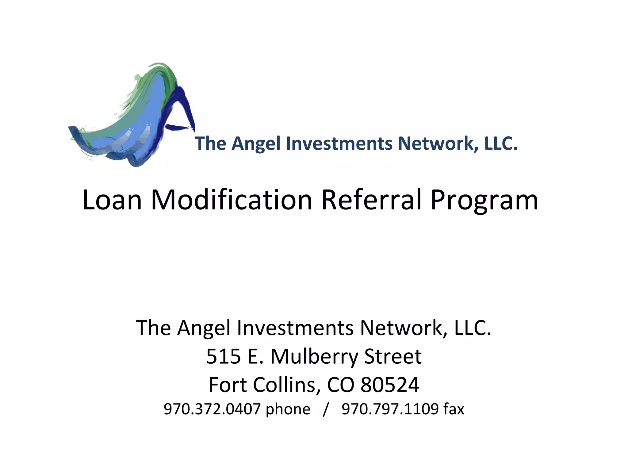 The document describes a loan modification referral program run by The Angel Investments Network, LLC. Agents can refer homeowners who need loan modifications and receive referral fees. The program uses a nationally recognized law firm that has a 98% success rate in getting loan modifications approved. Agents submit a simple one-page pre-qualification form to determine if a homeowner is eligible. If approved, agents receive a $300-$450 referral fee once the modification is signed.