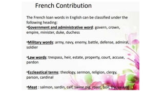 Loan words entered the English language in three main ways: through foreign invaders settling in England, via scholarship and cultural exchange, and from international contacts like war, trade, and travel. While English has borrowed from about 50 languages, the most influential have been Germanic words which make up the basic vocabulary and are usually short, one-syllable terms. Knowing a word fully involves recognizing its pronunciation, spelling, definition, and appropriate usage.
