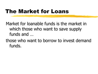 The document summarizes the loanable funds market, where savers supply funds and borrowers demand funds. The equilibrium interest rate is determined by the intersection of supply and demand. Shifts in supply and demand can change the equilibrium. For example, tax incentives for savings increase supply and reduce interest rates, while government budget deficits decrease savings and increase interest rates.