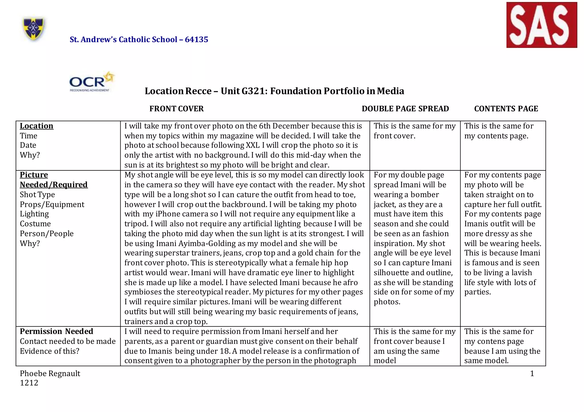 Phoebe Regnault is planning photoshoots for her magazine portfolio and provides details on the shots needed. She will take photos of her model, Imani Ayimba-Golding, at her school on December 6th to depict the magazine's topics. Eye-level shots will be taken mid-day without props for bright, clear photos. Permission is needed from Imani, her parents, and the school head teacher. Safety precautions will be taken and the school provides a low-risk location without transportation requirements.