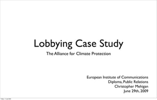 The document discusses the Alliance for Climate Protection, founded by Al Gore in 2006, which aims to mobilize public action and governmental response to the climate crisis through a campaign known as 'We'. It outlines key objectives including generating public opinion for climate solutions, reducing greenhouse gas emissions, and achieving carbon neutrality across various sectors. The campaign utilizes a combination of advertising, grassroots partnerships, and online organizing to engage a diverse audience and promote meaningful environmental actions.