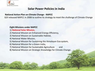 The document outlines investment opportunities in India's solar power sector, emphasizing the National Action Plan on Climate Change and the Jawaharlal Nehru National Solar Mission, which aims to establish India as a leader in solar energy. It discusses the mission's potential for achieving grid parity by 2022 and provides detailed phases for expanding solar capacity and the regulatory framework, including renewable purchase obligations. Additionally, it highlights the financial and non-financial benefits for investors and the comprehensive services offered by Lobel for solar power projects.