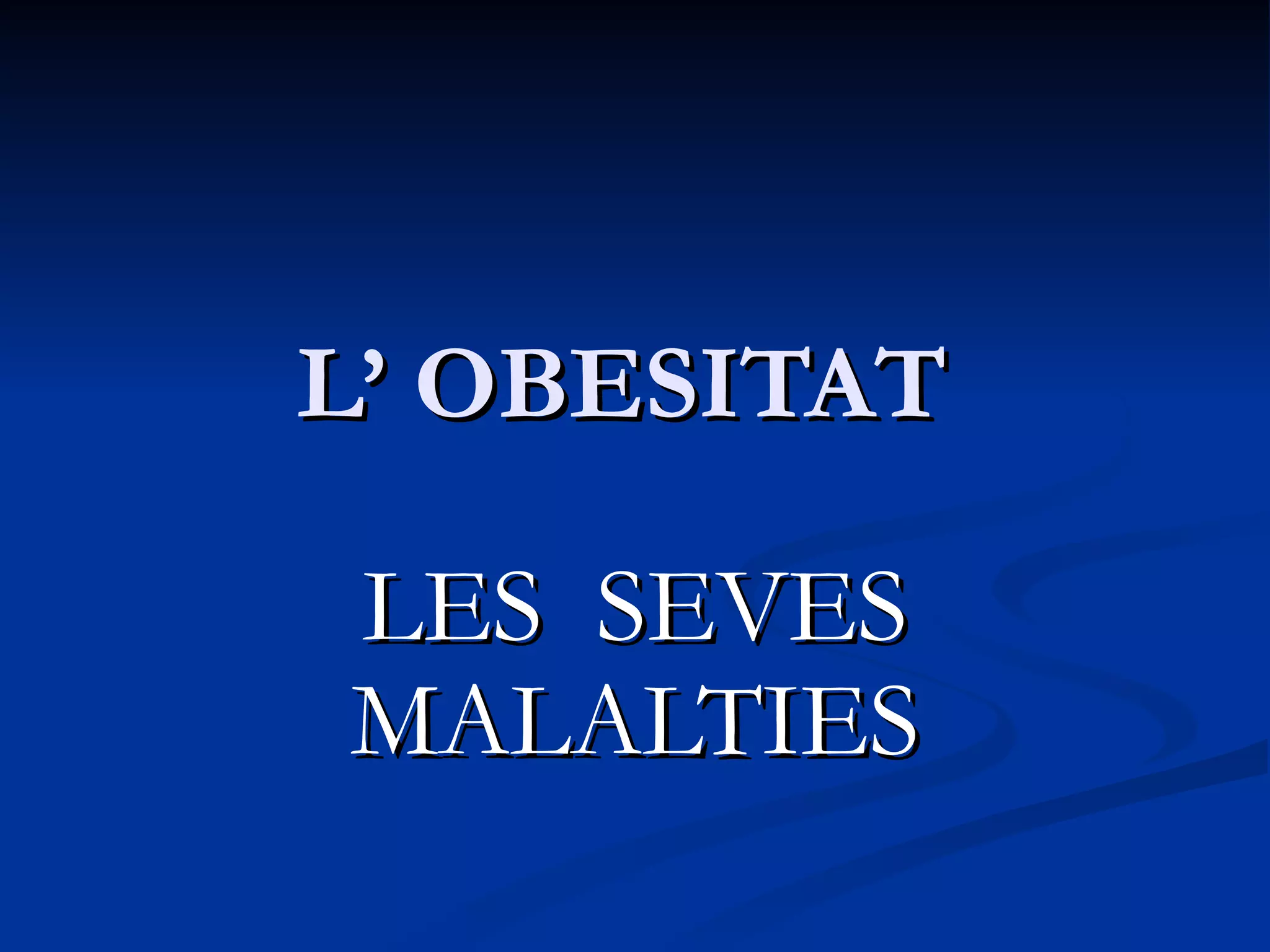 QUÈ ÉS L’OBESITAT?L' obesitat o adiposi és la condició del cos en la qual la quantitat de greix acumulat comporta risc per la salut, reduint l'esperança de vida de l'individu. Al llarg de la història la delimitació del concepte d'obesitat ha anat canviant: algunes cultures i religions la consideraven com un signe de riquesa i felicitat i no la tenien com una amenaça per la salut.