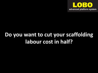 The Lobo system is a modular access platform designed for working at height without the need for tools, which significantly reduces scaffolding labor costs. It offers various advantages, including compliance with safety regulations, ease of use, and a short payback period, while being applicable in multiple industries such as aviation and automotive. Case studies illustrate substantial savings for companies by switching from traditional scaffolding to the Lobo system.