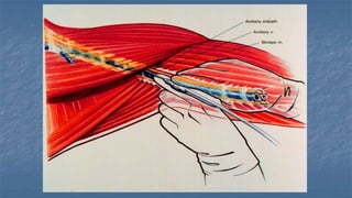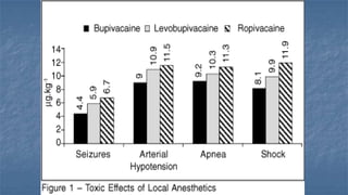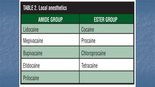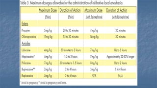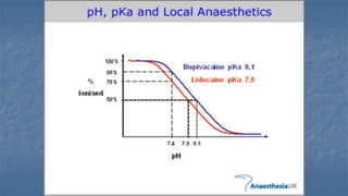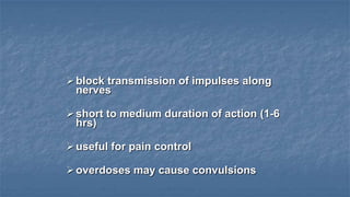 Local anaesthesia involves blocking nerve transmission through injection of local anaesthetic drugs near nerve endings or trunks. The document discusses various local anaesthetics including esters like cocaine and procaine, and amides like lidocaine, bupivacaine and prilocaine. It describes how local anaesthetics work by inhibiting sodium channels and preventing nerve impulse conduction. The ideal properties, structures, mechanisms of action, and uses of different local anaesthetics are summarized.
