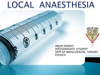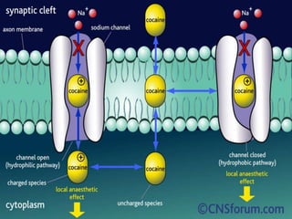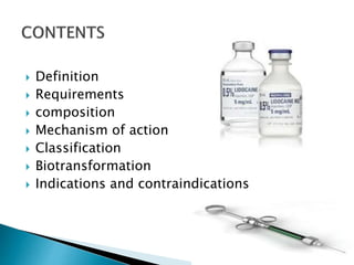 The document discusses local anesthetics, including their definition, requirements, mechanisms of action, classifications, and biotransformation. It notes that local anesthetics work by inhibiting sodium influx through voltage-gated sodium channels in neuronal cells, blocking nerve conduction. Local anesthetics are classified based on duration of action, chemical nature, and origin. Common examples are discussed and appropriate uses along with potential complications and contraindications are outlined.