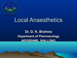 - Local anesthetics are drugs that cause reversible loss of sensation, especially pain, in a localized area of the body when applied topically or injected locally. They block the generation and conduction of nerve impulses at the site of contact without damaging neurons.