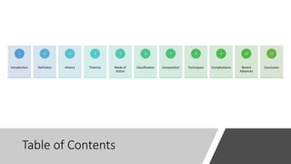 This document provides an overview of local anesthesia. It begins with definitions of local anesthesia and discusses its history from the isolation of cocaine in 1859 to the development of modern local anesthetics like lidocaine. It describes the ideal properties, theories of action, classification, composition, maximum doses, armamentarium, techniques for maxillary and mandibular injections, and potential complications. The key information is that local anesthesia temporarily interrupts nerve conduction to produce loss of sensation in a circumscribed area, allowing for painless dental procedures.