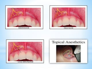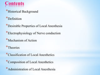 The document comprehensively outlines local anesthesia, detailing its historical background, definition, desirable properties, mechanisms of action, classifications, and various administration techniques. It describes the physiological basis of nerve conduction and the interaction of anesthetics with nerve membranes, alongside the types of local anesthetics categorized as esters or amides. Additionally, the document covers potential complications and important considerations for special care groups, ensuring a clear understanding of local anesthetic practices within medical and dental contexts.