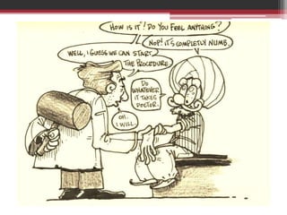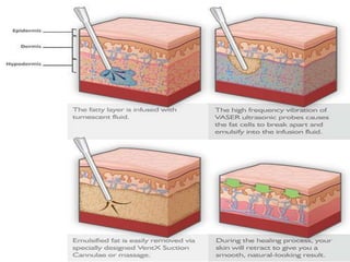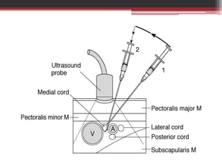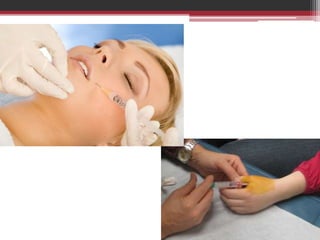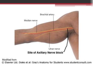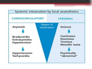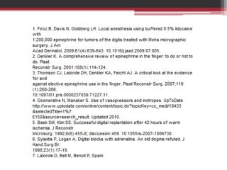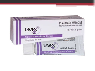 This document provides information on local anesthetics used in plastic surgery. It defines local anesthesia and classifies local anesthetics as esters or amides. It describes the pharmacology of different local anesthetics including onset, maximum dose, and duration. It discusses the ideal properties of a local anesthetic and the benefits of adding a vasoconstrictor like epinephrine. The document also covers different techniques for local anesthesia including topical, infiltration, nerve blocks, and tumescent anesthesia. It provides details on administering local anesthetics safely and effectively for plastic surgery procedures.