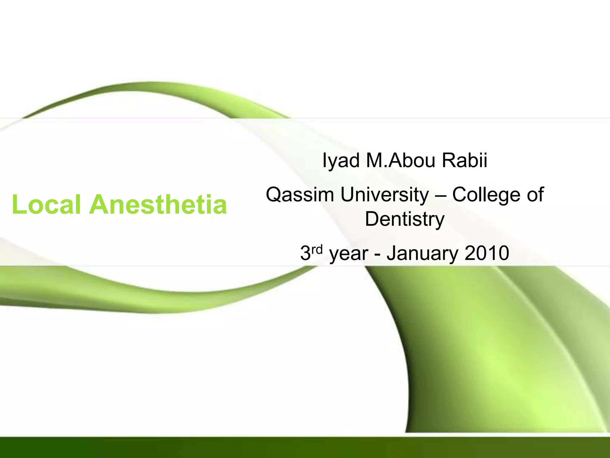 This document provides information on local anesthesia. It begins by defining local anesthesia and classifying local anesthetics. It then discusses the pharmacokinetics and mechanisms of action of local anesthetics. Factors that affect the efficacy of local anesthetics like pH, inflammation, dosage, and vasoconstrictors are covered. Potential adverse effects and allergic reactions are described. Guidelines for administering local anesthesia to special patient populations like children, handicapped patients, and those on anticoagulants are provided. The document concludes by discussing dosing considerations and choices of local anesthetic for different procedures.