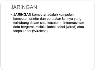 Jaringan komputer adalah kumpulan perangkat yang terhubung untuk berbagi sumber daya dan informasi melalui berbagai jenis jaringan seperti LAN, MAN, dan WAN. Seiring perkembangan teknologi, berbagai topologi jaringan dan jenis sistem, seperti client-server dan peer-to-peer, telah muncul untuk memenuhi kebutuhan komunikasi dan pengolahan data. Protokol jaringan, yang diatur oleh standar internasional, adalah penting untuk memastikan kompatibilitas dan komunikasi yang efektif antara perangkat yang berbeda.