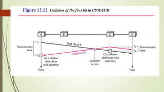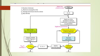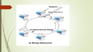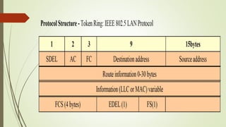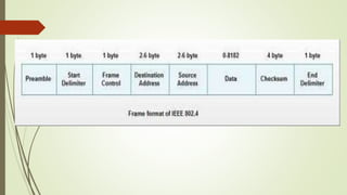A local area network (LAN) uses wired connections to connect devices within a limited geographic area like a building or campus. Ethernet became the dominant wired LAN technology using carrier sense multiple access with collision detection (CSMA/CD) to regulate shared access to the transmission medium. Ethernet has evolved from 10 Mbps to 100 Mbps to 1 Gbps standards to meet increasing bandwidth demands. Key components of wired LANs include network adapters, cabling, connectors, switches/hubs, and software protocols. Other historical wired LAN technologies like Token Ring and Token Bus used token passing for medium access but have been largely replaced by Ethernet.