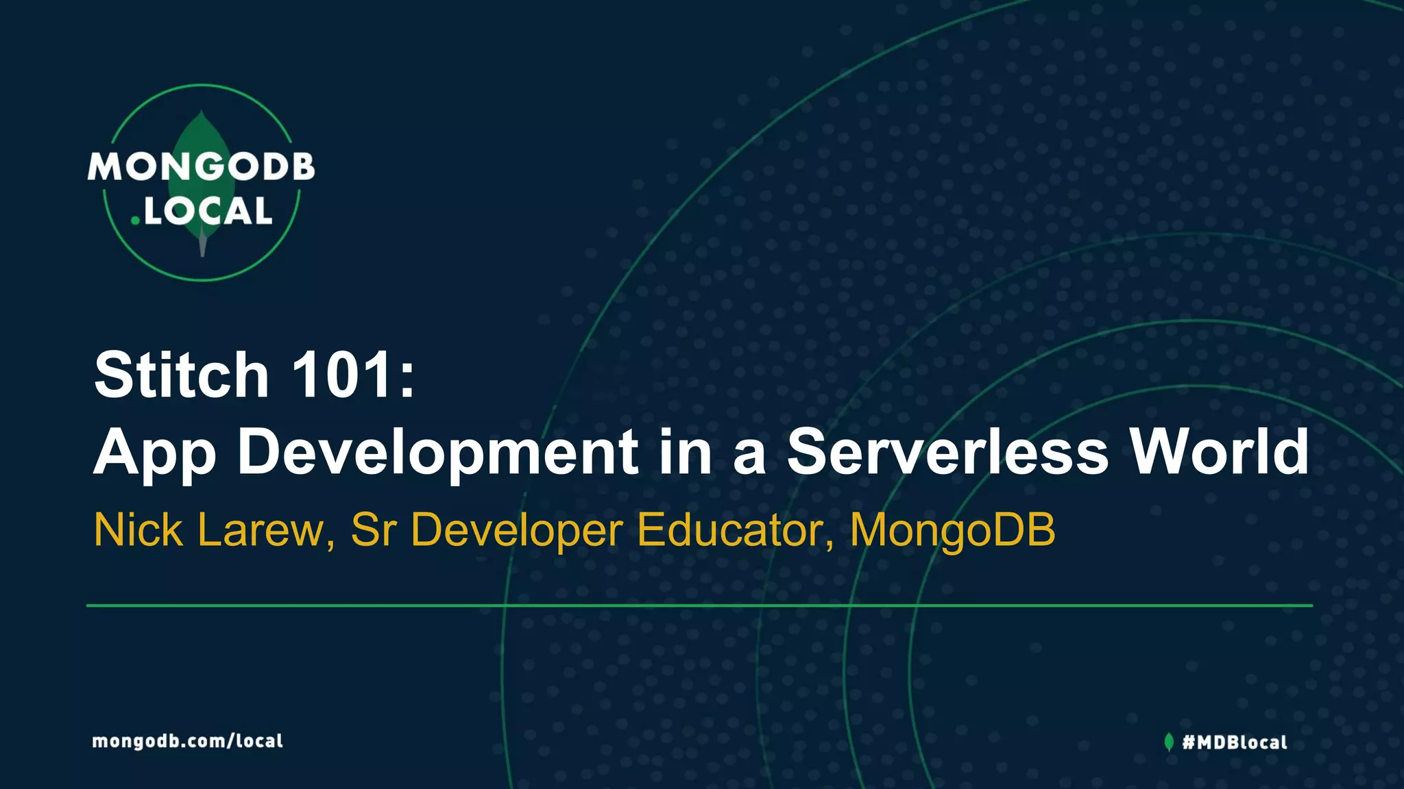 The document provides an overview of serverless application development using MongoDB Stitch. It describes how traditional applications require developers to manage infrastructure like servers and databases, while serverless architectures allow developers to focus on building features by leveraging platform services for infrastructure concerns. The document demonstrates a concert finder app built with Stitch that uses services for user authentication, data storage, and external APIs, without requiring management of servers or databases.