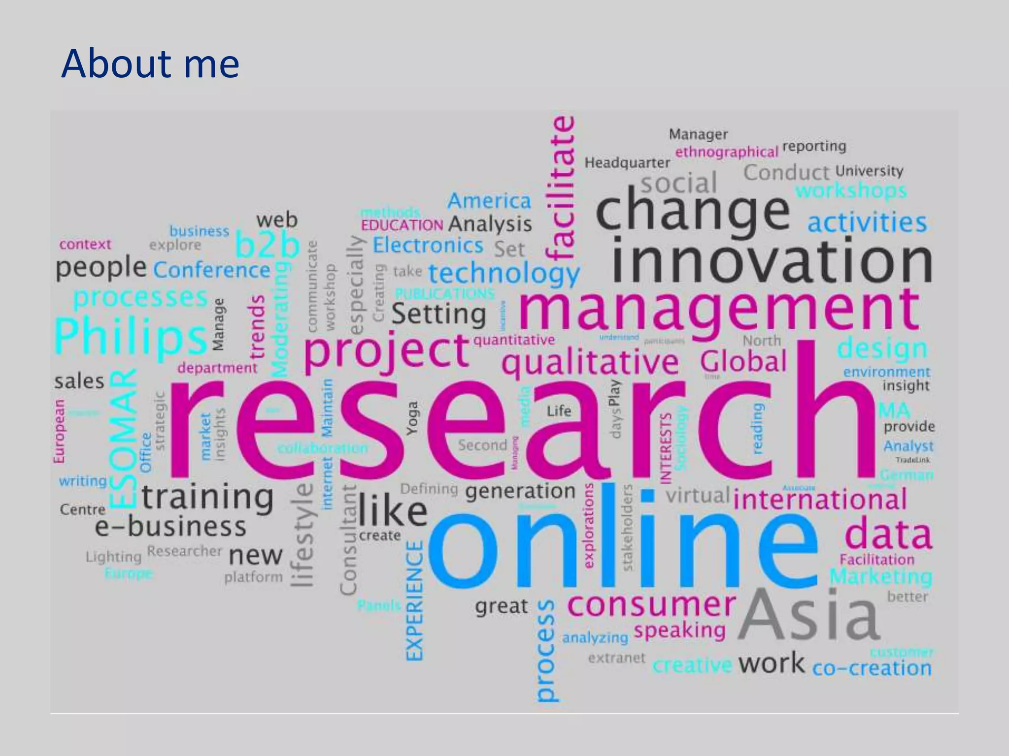 This document discusses online qualitative research methods and the potential of using social media platforms and online activities. It argues that online research allows researchers to immerse themselves in the context of participants' lives through a variety of active and passive approaches, including asking questions, assigning tasks, listening, and observing. A combination of different activity types over an extended period of time can provide rich contextual data and behavioral insights in a cost-effective manner. The document provides examples of customized online research designs using diaries, photos, videos, and discussions to understand topics like digital lifestyles, product usage, and new product launches.