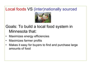 This document discusses distribution and infrastructure challenges for local foods in Minnesota. It identifies trends of increasing local food consumption and options to reduce energy use such as backhauling and product aggregation. Several types of distributors that carry local foods are described, including cooperative distributors and traditional wholesalers. Reasons why farmers and buyers may prefer to use distributors over direct sales are provided.
