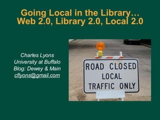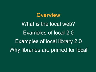 The document discusses the concept of the "local web" and how libraries can get more involved in it by providing locally relevant information and resources to their communities. It describes how the local web includes information like local search engines, blogs, photos, maps, and data. The document suggests libraries can create their own local search engines and blogs, aggregate local images and data, and get more involved in local online communities. Libraries are well-positioned to participate in the local web due to their focus on communities and experience providing information.
