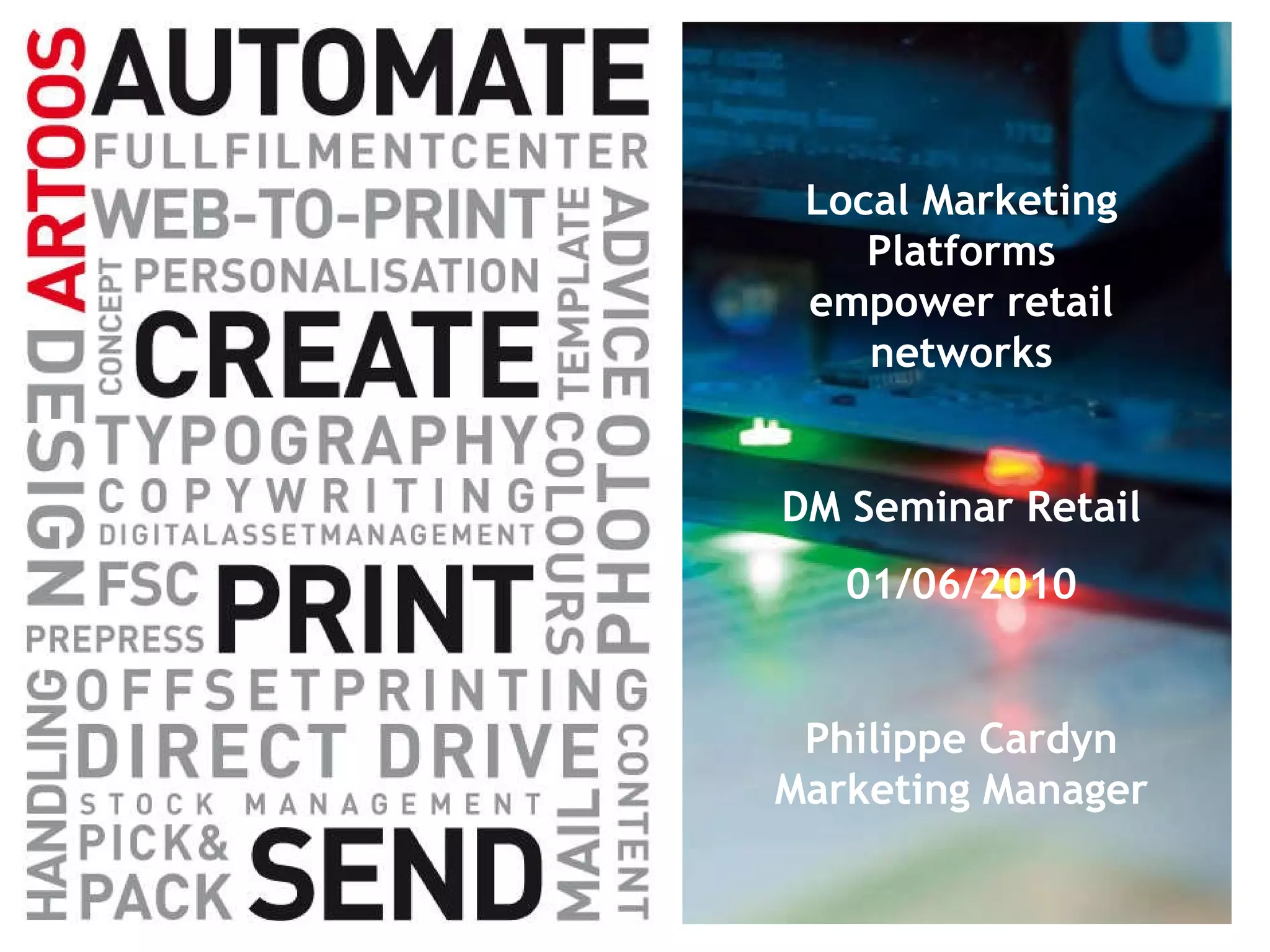 The document discusses local marketing platforms and how they empower retail networks. It provides examples of how various companies use local marketing platforms to simplify communication channels for retailers, brands, and marketers. Specifically, it outlines cases for how finance/insurance, automotive, real estate, and apparel companies utilize centralized, web-based tools to automate and personalize local marketing campaigns.