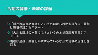 活動の背景・地域の課題 「緑と水の連絡会議」という名前からわかるように、最初 は環境保護からスタート 『人』も環境の一部では?というのとで交流系事業がス タート 現在は過疎、高齢化がすすんでいるなかで地域の活性化を 図る