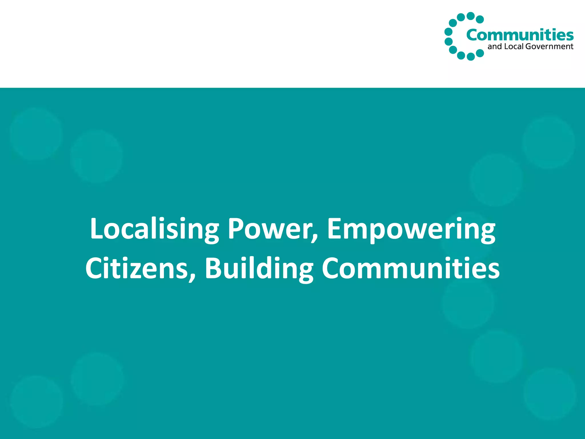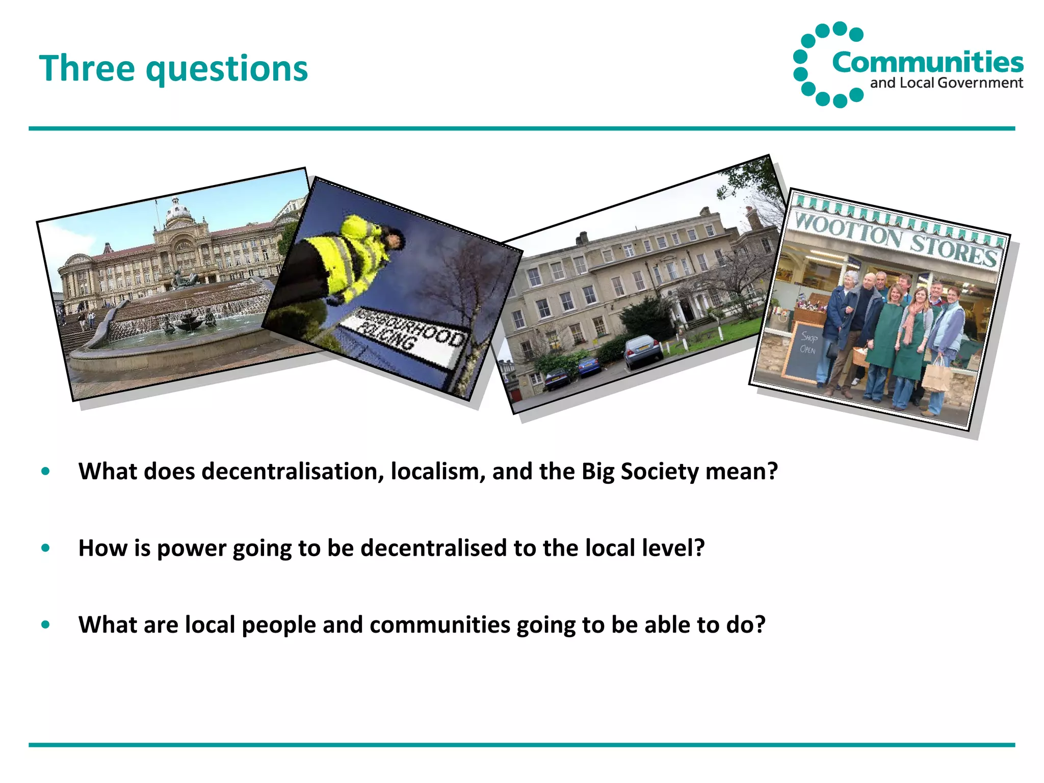 The document discusses the UK government's goals of decentralization, localism, and empowering communities through the "Big Society" initiative. It aims to devolve power to local levels by lifting bureaucracy, increasing community control over public finances, diversifying public service providers, making government more transparent, and strengthening local accountability. New powers for communities include the right to challenge or take over public services and buildings, neighborhood planning, and a Big Society Bank to fund social enterprises. The initiative seeks to give citizens more opportunities to get involved in their communities and more influence over local decisions and services.