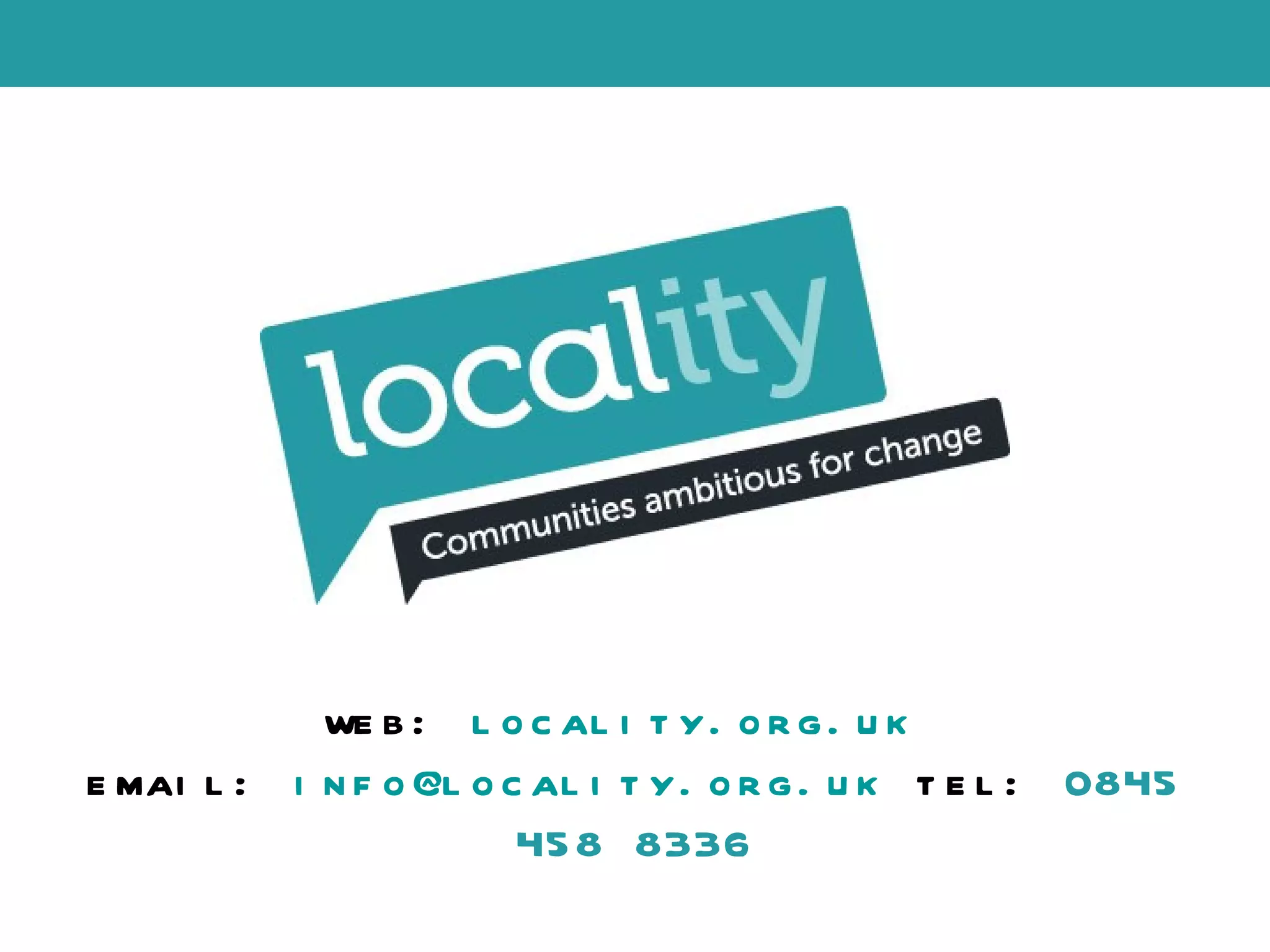Locality is a leading network of community organizations in the UK that was formed through the merger of two other networks. It believes that every community has potential. Locality's members are independent, led by local people, work to drive social change, trade for community benefit, and develop community assets and ownership. Locality held its first national convention in November 2011 in Manchester to discuss community issues and network.