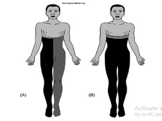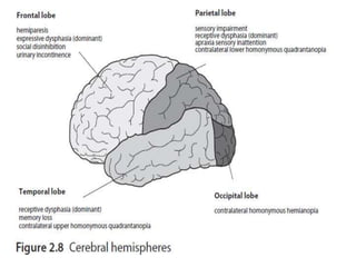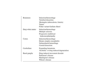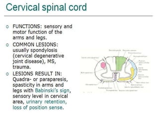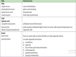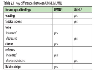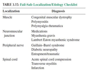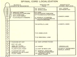 This document discusses neurological examination and localization of lesions in the nervous system. It describes the steps in neurological diagnosis and provides information on localization of lesions at different levels of the neuraxis from the cortex to muscles. Key signs and symptoms are outlined for upper motor neuron and lower motor neuron lesions, as well as peripheral nerve disorders, neuromuscular junction disorders, and muscle disorders. Specific examination findings that help localize lesions in different parts of the brain, spinal cord, nerves, and neuromuscular junction are also summarized.