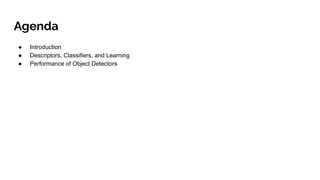 The document discusses the fundamentals of object detection systems, detailing the processes of localization, classification, and evaluation. It explains descriptors, classifiers, and learning techniques, including supervised and unsupervised learning methods, along with performance evaluation metrics such as precision, recall, and accuracy. Additionally, the document emphasizes the importance of combining various learning approaches to enhance classifier performance in detecting objects.