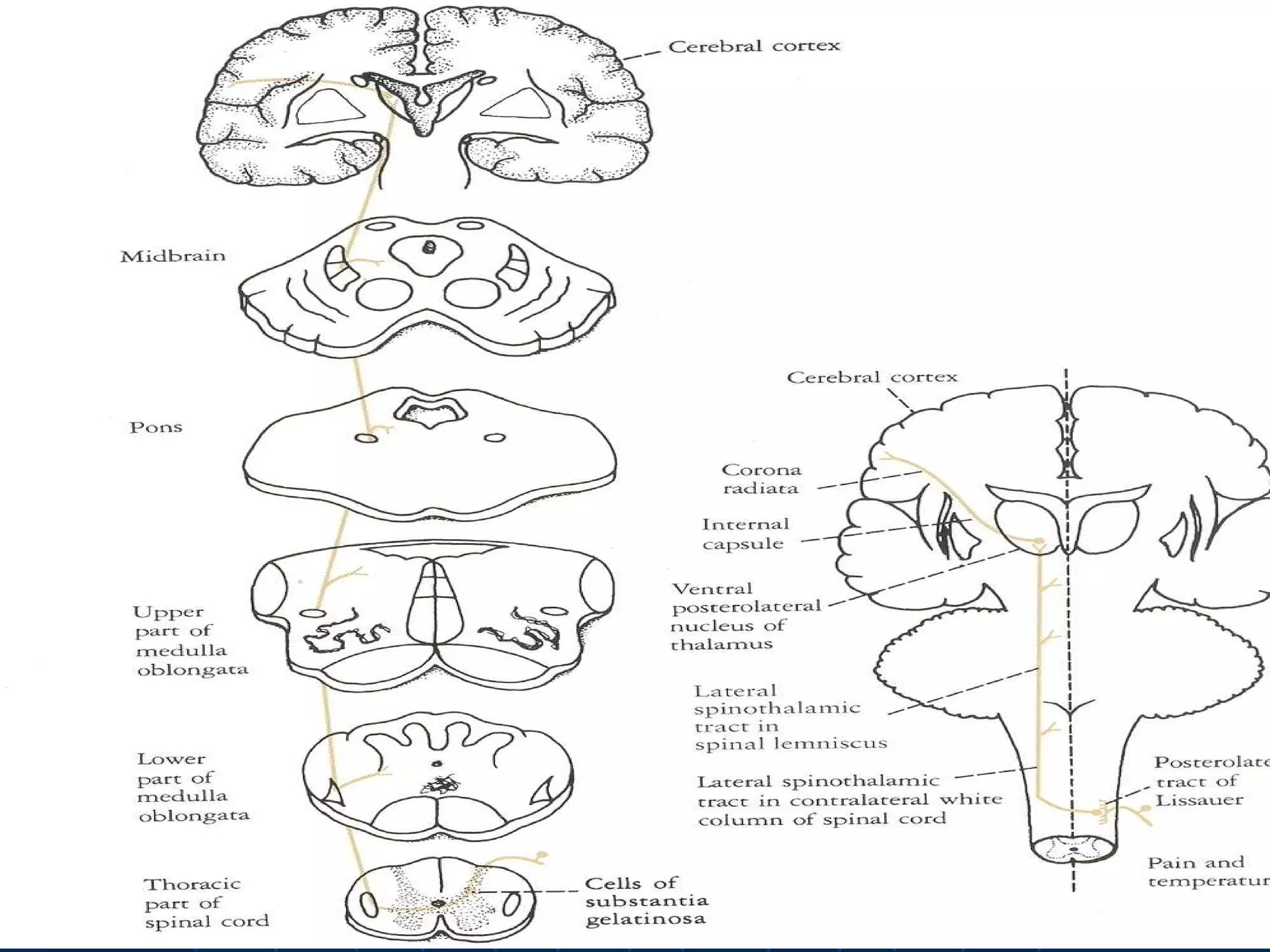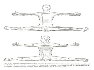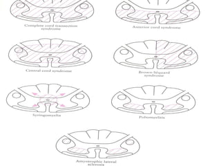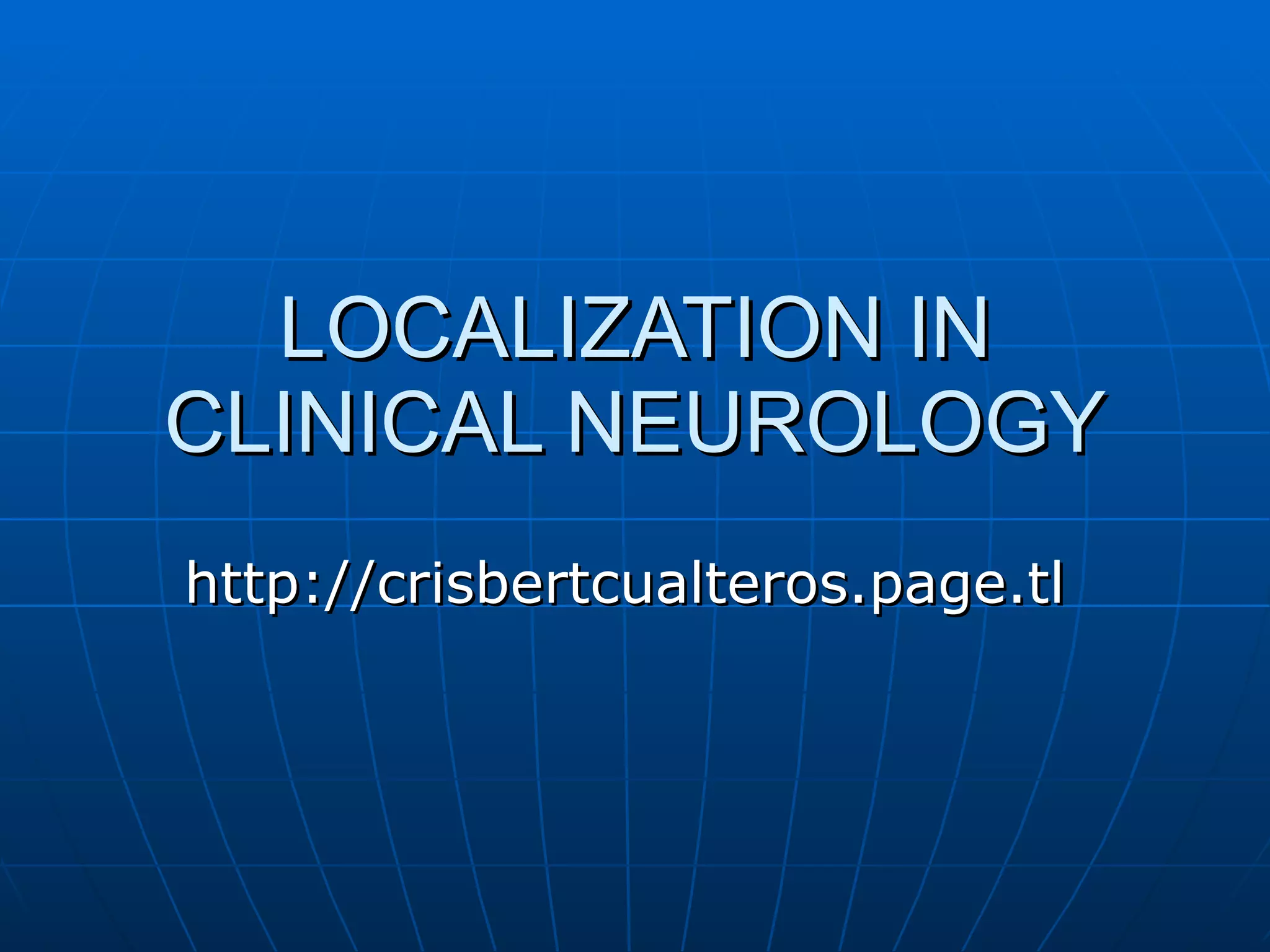 This document provides information to help localize neurological deficits based on symptoms and signs. It discusses localization in the upper motor neuron system including the cortex, corona radiata, internal capsule, brainstem, and spinal cord. It also discusses localization in the lower motor neuron system including the anterior horn, root/plexus, and nerves. Localization is guided by features like patterns of weakness, sensory loss, reflex changes, and specific cranial nerve involvement.