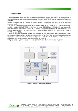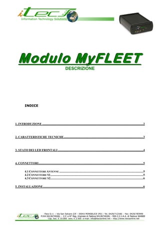 Il modulo MyFleet è un dispositivo mobile versatile con tecnologia GSM e GPS, integrato con un microcontrollore ARM7. Ha caratteristiche tecniche avanzate come memoria espandibile, diversi input/output e una batteria ricaricabile. Il documento descrive anche i connettori, il funzionamento dei LED frontali e le linee guida per l'installazione.