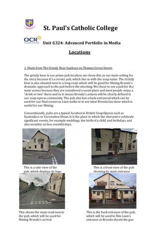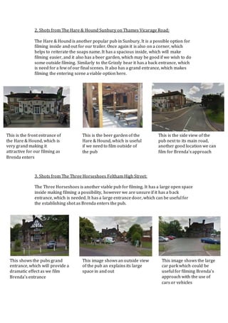 This document discusses potential filming locations for a soap opera trailer in Sunbury, England. It examines five pubs - The Grizzly Bear, The Hare & Hound, and The Three Horseshoes - as the primary locations. These pubs offer interior and exterior shots, back entrances for certain scenes, and establish the working class setting. Additional locations mentioned are Sunbury Cross for its busy atmosphere and local roads showing socioeconomic contrasts within Sunbury.