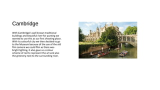 Cambridge - The document discusses filming in Cambridge to capture the city's traditional buildings, river for punting, and colorful scenery. They filmed at the museum for its bright lighting and color scheme of red representing art and greenery by the river.
