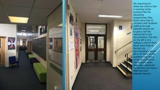 The document discusses three shots that could be included in a documentary about life in 6th form college. The first shot shows a hallway between lessons to depict students' natural behavior. The second shot is of an assembly room taken from above to show students' varying levels of attention and work ethic. The third shot shows an entire classroom to demonstrate students in a learning environment, as seen in other educational documentaries.