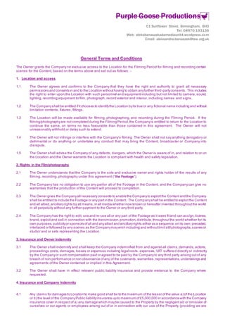 Purple Goose Productions seeks permission from Lee Hadley to film at Haberdashers’ Abraham Darby school from May 22nd 2018 to July 20th 2019 for their TV programme "Educating Telford". The location agreement outlines the filming period and terms, including that Purple Goose Productions will have sole ownership of footage and rights to use it as they wish in future broadcasts. Lee Hadley agrees to make the location available and not interfere with filming. Both parties agree to indemnify the other and maintain appropriate insurance.