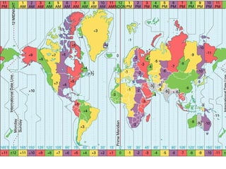 The document discusses the history and development of latitude, longitude, and timekeeping systems. It explains that latitude and longitude were developed in the Middle Ages to create a global grid system for location. It then provides details on latitude and longitude lines and degrees, and how they are used to precisely locate places on Earth. The document also outlines the development of standardized time zones to facilitate global communication and travel, and covers the establishment of the Prime Meridian, International Date Line, and daylight saving time.