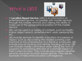Location-based services (LBS) are mobile applications and services that utilize a device's geographic location. LBS provide information to users about their surroundings, such as the nearest ATM, gas station, or restaurant. They also allow users to track packages, vehicles, and even locate friends or employees. Common examples of LBS include personalized weather services, location-based games, mobile coupons, and advertising targeted to a user's current location.